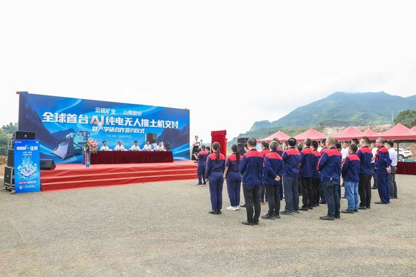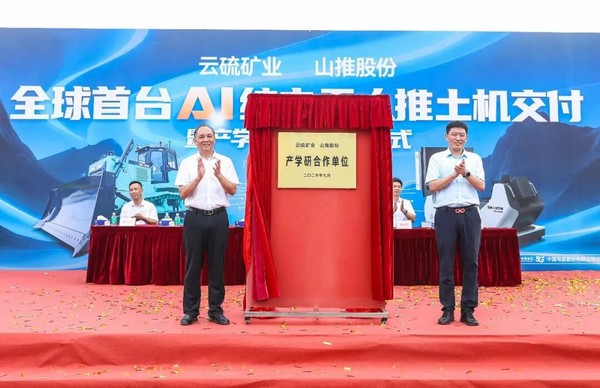 儀式上,云硫礦業與山推完成“金鑰匙”交付,標志著全球首臺AI純電無人推土機正式投入使用;雙方簽署戰略合作協議;共同為“云硫—山推產學研合作基地”揭牌。一系列儀式莊重而高效,展現出雙方合作層次的不斷深化。