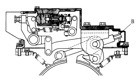 3)制動帶抱緊制動鼓后,再將螺母(B)擰松1-5/6圈,使制動鼓與制動帶間的間隙0.3mm。相應地,制動踏板的行程為90-110mm。